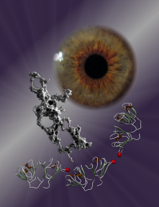 Cataract, which is a major cause of blindness, results when one or more of the structural crystallins aggregate, causing opacity of the lens. This appears to occur after alpha-crystallins have been titrated out. We are using optical spectroscopy as well as solution and solid-state NMR to investigate both the native and aggregated states of gammaS-crystallin. Solid-state NMR methods that have been previously applied to other locally-ordered systems, such as amyloid fibrils and silk, will allow comparisons between the structures of the cataract aggregate and the native protein. Discovering the differences between these two states of gammaS-crystallin will elucidate the process of cataract formation and may lead to the design of new therapeutics or artificial eye lens materials.